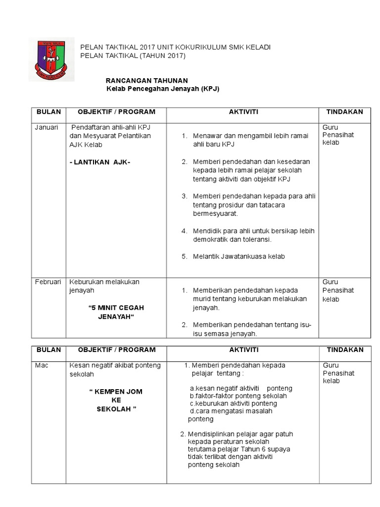 Naib pengerusi yayasan pencegahan jenayah malaysia (mcpf), tan sri lee lam thye, berkata walaupun jenayah rogol membabitkan pelajar di negara ini menunjukkan penurunan iaitu 133 kes pada tahun lalu, berbanding 222 kes. Struktur organisasi kelab pencegahan jenayah sekolah. Aktiviti kelab pencegahan jenayah sk pengkalan rinting bulan aktiviti objektif januari mesyuarat ko kurikulum mesyuarat induk/guru penasihat mesyuarat agung kelab pencegahan jenayah • memberi pendedahan kepada para ahli tentang prosedur dan tatacara bermesyuarat. Kelab pencegahan jenayah sekolah boleh menubuhan kelab pencegahan jenayah melalui kempen keselamatan yang berterusan. Kelab pencegahan jenayah ialah kelab yang ditubuhkan di semua sekolah rendah dan sekolah menengah kerajaan merujuk kepada surat pekeliling ikhtisas bil 5/2006 4.
