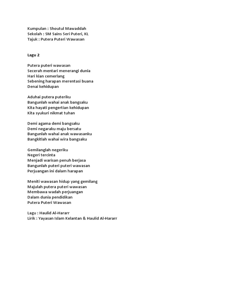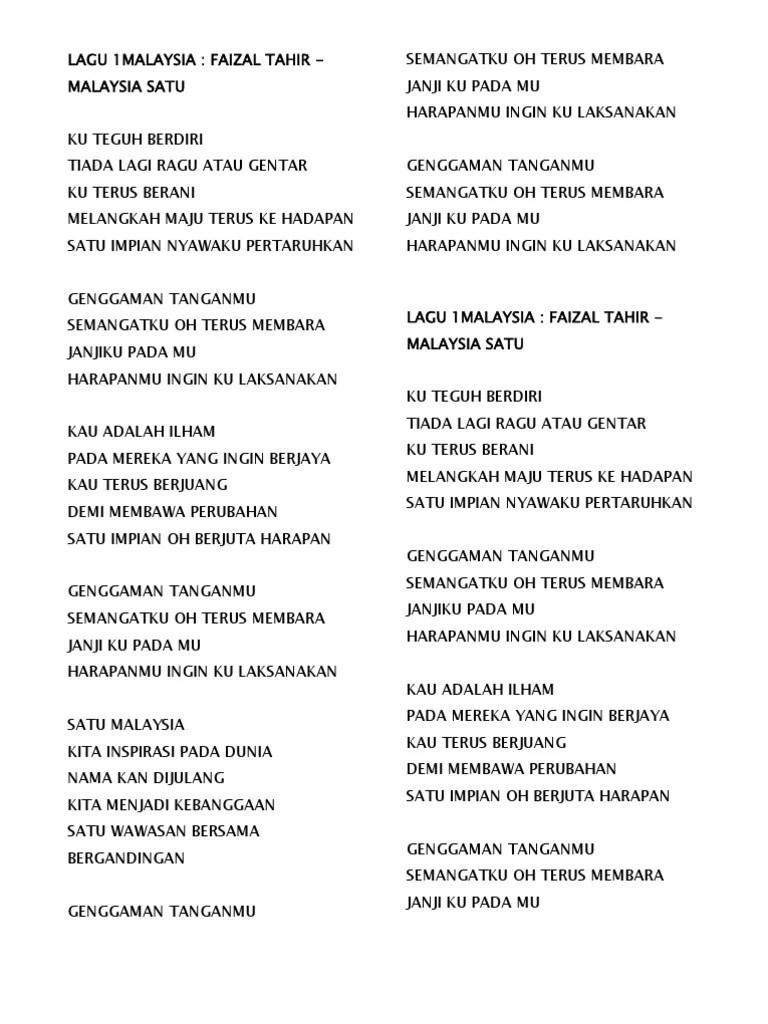 Lirik lagu wawasan setia warga uitm Bendera berkibar di angkasa lambang negara jaya rakyat sepakat sehati sejiwa dengan berbakti dengan megah hadapi cabaran masa muka penuh tenaga murni bakti d. Digabungkan dengan judul '2020' sudah pastilah tindakan ini dianggap satu kritikan mereka terhadap kerajaan ketika itu. Bahtera merdeka bahan bantuan mengajar ( bbm ) buat kali pertama ) lagu malaysia! Bendera berkibar di angkasa lambang negara gagah rakyat sepakat sehati sejiwa tekad berbakti dengan megah. Lirik lagu ini menggambarkan impian rakyat malaysia untuk meningkatkan kemajuan negara dan merasai nikmat kemewahan tanpa kepincangan apabila tahun 2020 tiba. For more information and source, see on this link : Wawasan meningkat kemajuan tiada lagi kepincangan Oleh kru telah dikeluarkan dan menyatakan bahawa kementerian penerangan malaysia pada tahun telah mengharamkan 11 lagu daripada album canggih. Hadapi cabaran masa muka penuh tenaga murni bakti dicurah sehara sehala dengan wawasan yang suci. Lagu ini sangat memberi inspirasi dan motivasi untuk kita terus mempertahan dan memperingati segala hasil usaha dan titik peluh perwira negara dalam mencapai kemerdekaan. Wawasan meningkat kemajuan tiada lagi kepincangan Sabah edition wahhh masa sekolah rendah dulu admin mmg facebook.