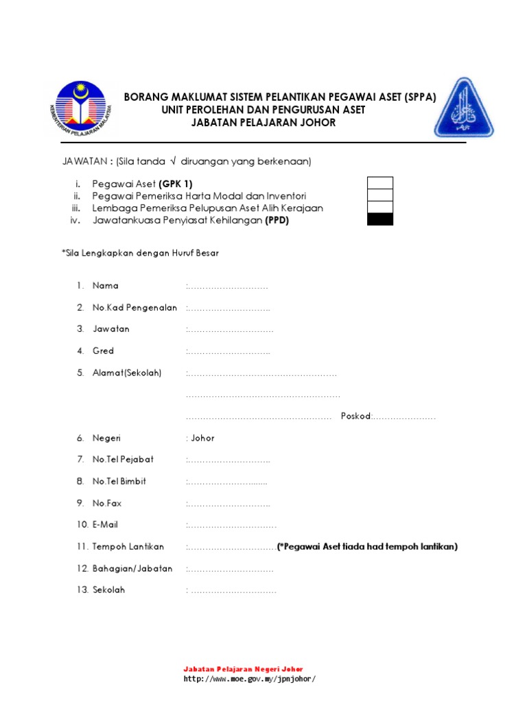 Penggunaan borang baharu sistem lantikan pegawai aset slpa jabatan pendidikan negeri johor. Sistem pelantikan pegawai aset kpm. Borang maklumat sistem pelantikan pegawai aset sppa unit perolehan dan pengurusan aset jabatan pelajaran johor. Jun 24, 2015 · borang maklumat sistem pelantikan pegawai aset sppa unit perolehan dan pengurusan aset jabatan pelajaran johor. Pegawai aset 7 3 6 kedudukan aset hidup haiwan ikan dan tumbuhan.