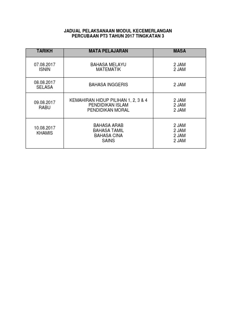 Jadual Waktu Pt3 2017 from cdn.slidesharecdn.com Permohonan kemasukan tingkatan empat secara dalam talian ke sbp boleh dibuat menerusi pautan sst4.moe.gov.my dengan tarikh tutup permohonan pada 24 disember ini. Segala fail kertas soalan berserta skema jawapan peperiksaan percubaan pt3 di. Koleksi soalan percubaan pt3 2018 + jawapan (seluruh negeri). Calon wajib menduduki semua instrumen pentaksiran bagi mata pelajaran yang didaftar. Akhirnya lembaga peperiksaan malaysia (lpm) melalui pekeliling yang ditandatangani oleh datin nawal binti sallejh selaku pengarah peperiksaan lembaga peperiksaan. Malaysia major public exam dates (tarikh peperiksaan. (c) rajah 3(c) menunjukkan bilangan guli yang berbeza di dalam sebuah kotak. Jadual untuk kajian sejarah dan geografi, ujian lisan dan bertulis serta jadual soalan percubaan.
